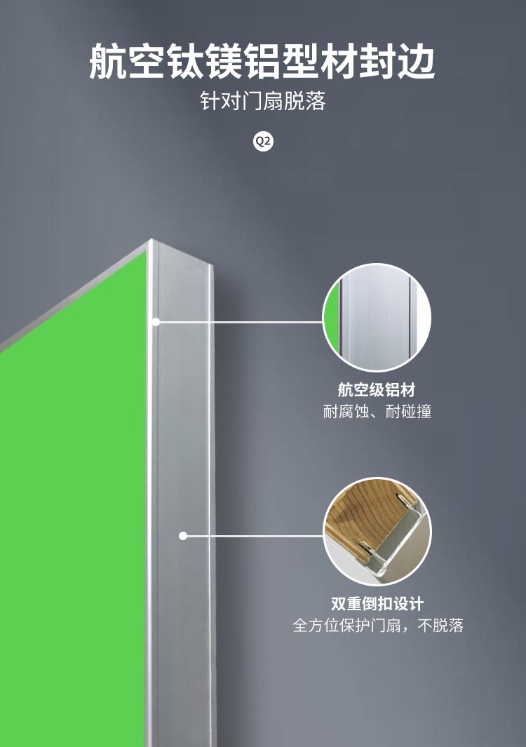 門扇設(shè)計(jì)了鈦鎂鋁合金型材封邊,雙重倒扣設(shè)計(jì),保護(hù)門扇,不脫落。