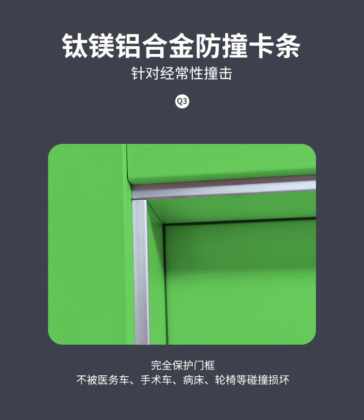 門框設(shè)計(jì)了鈦鎂鋁合金防撞卡條,保護(hù)門框不被醫(yī)務(wù)車、手術(shù)車、病床和輪椅等碰撞損壞。